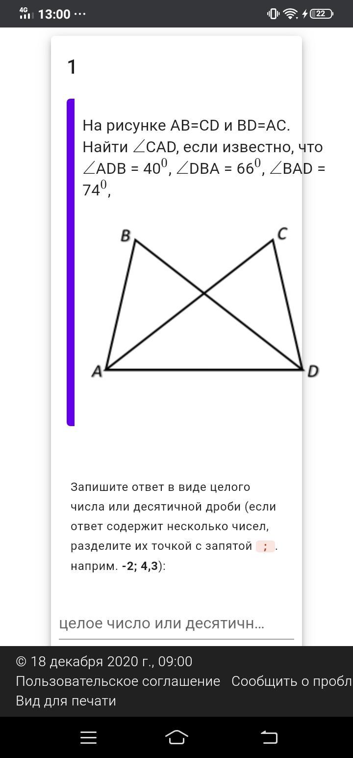 В тр-ках ABD и DCA, AB=CD, BD=AC по условию, а сторона AD - общая. Значит △ABD=△DCA по 3му признаку. => <CAD=<ADB=40°