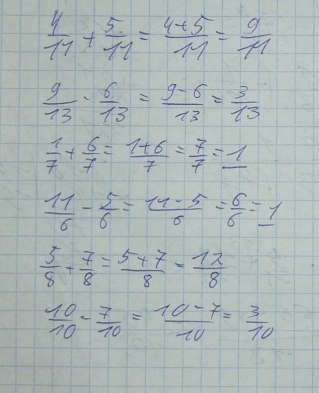 4/11+5/11= 9/11, 9/13-6/13=3/13, 5/8+7/8=12/8, 10/10-7/10=3/10