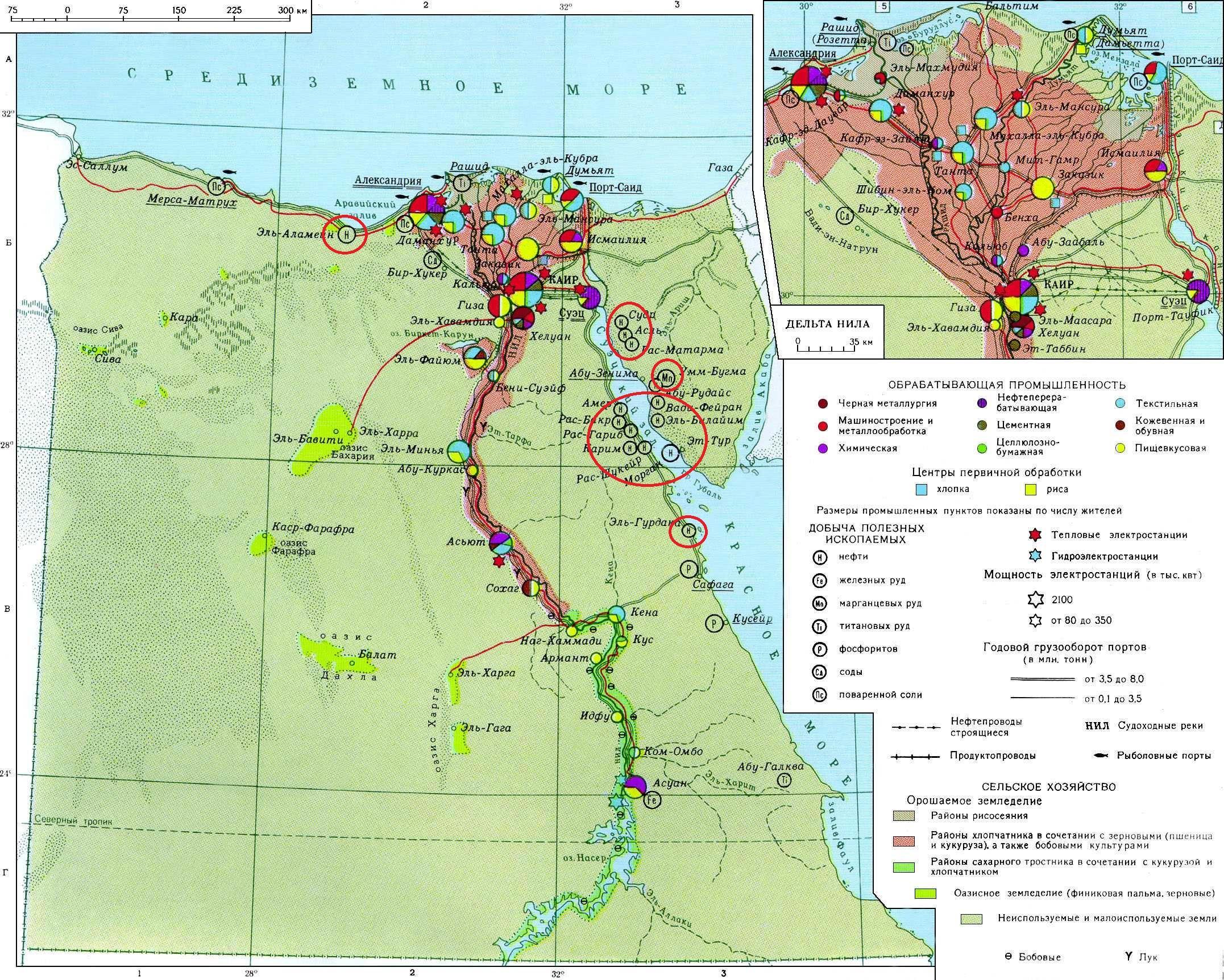 Как видно из карты, которая дана ниже в приложении, в Египте добывают нефть и марганцевые руды.