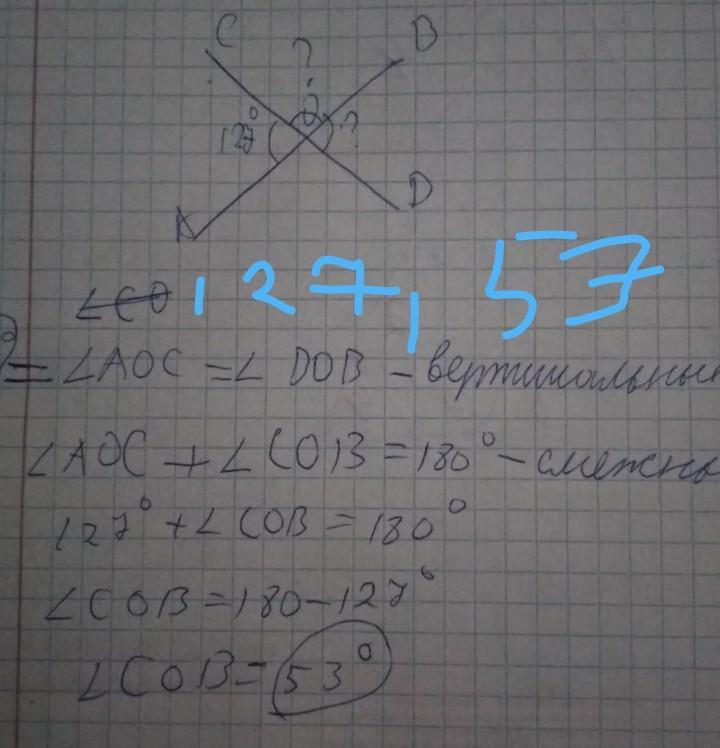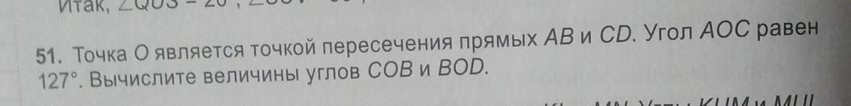 51. Точка О является точкой пересечения прямых AB и CD. Угол АОС равен