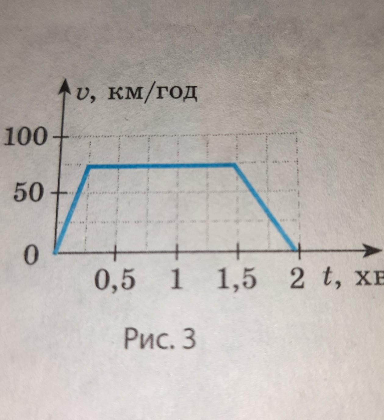 на рис. 3 наведено графік швидкості руху автомобіля. Визначте максимальну швидкість руху автомобіля та весь шлях, що він подолав.