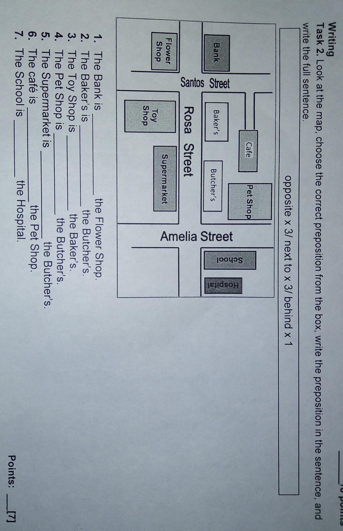 Task 2. Look at the map, choose the correct preposition from the box, write the preposition in the sentence, and