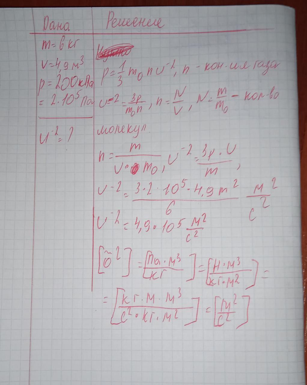 вычислите соседний квадрат скорости движения малекул газа если его m = 6кг объем V4.9 и давление p=200кПа