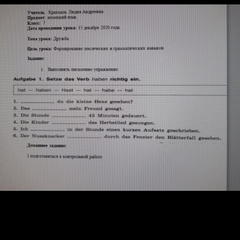 Aufgabe 1. Setze das Verb haben richtig ein. hat-hatben- Hast - hat-habe-hat 1..........du die kleine Hexe gehen? 2. Des..........mein Freund gesngt. 3. Die Stunde.......... 45 Minuten gedauert. 4 Die Kinder........ das Herbetiled geungen. 5. Ich..........in der Stunde einen kurzen Aufsatz geschrieben. 6. Der Nusknacker..........durch das Fenster den Blattertall gesehen.