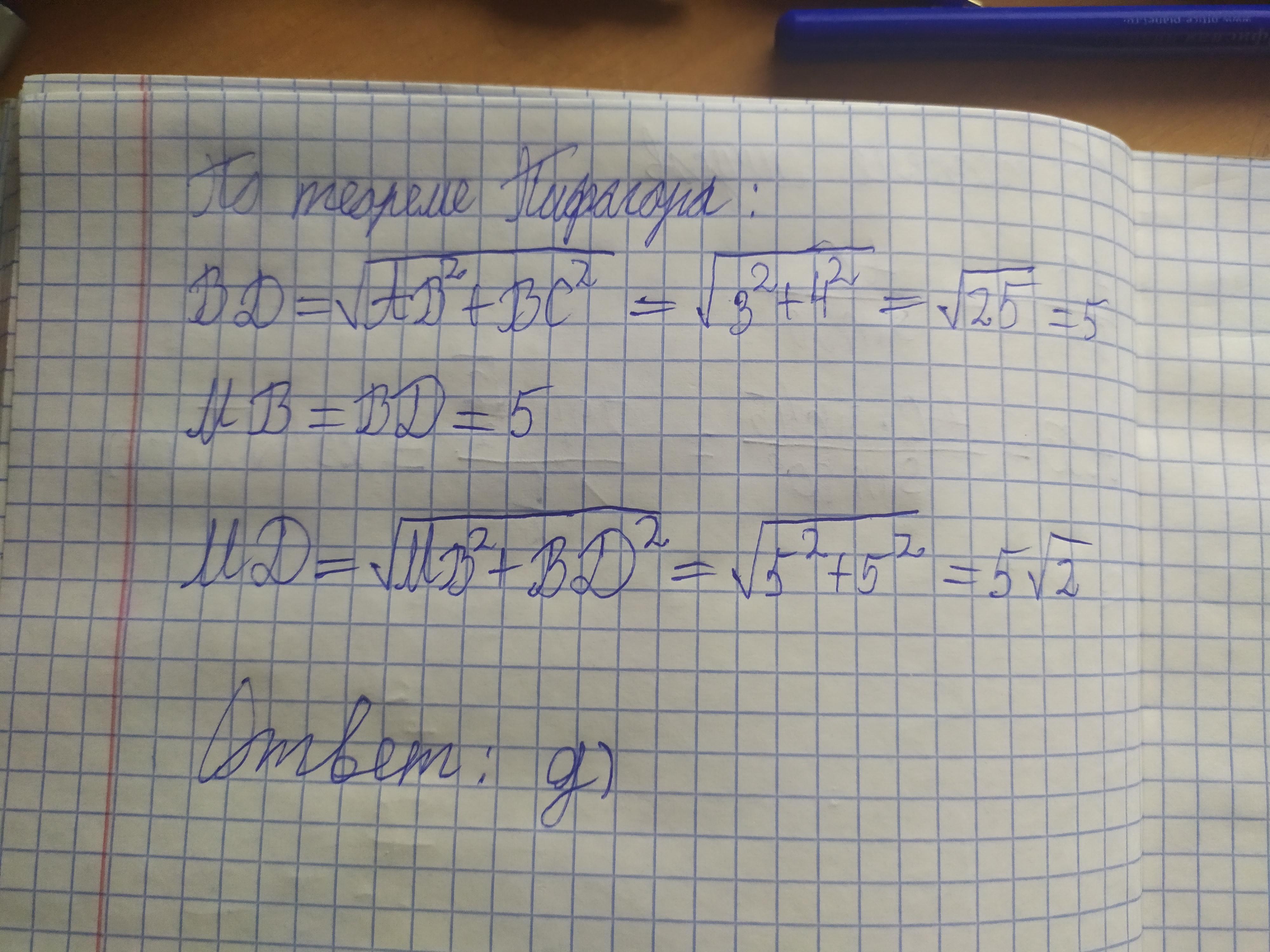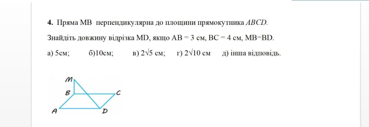 Найдите длинну отрезка MD, если АВ = 3 см, BС = 4 см, MB = BD.