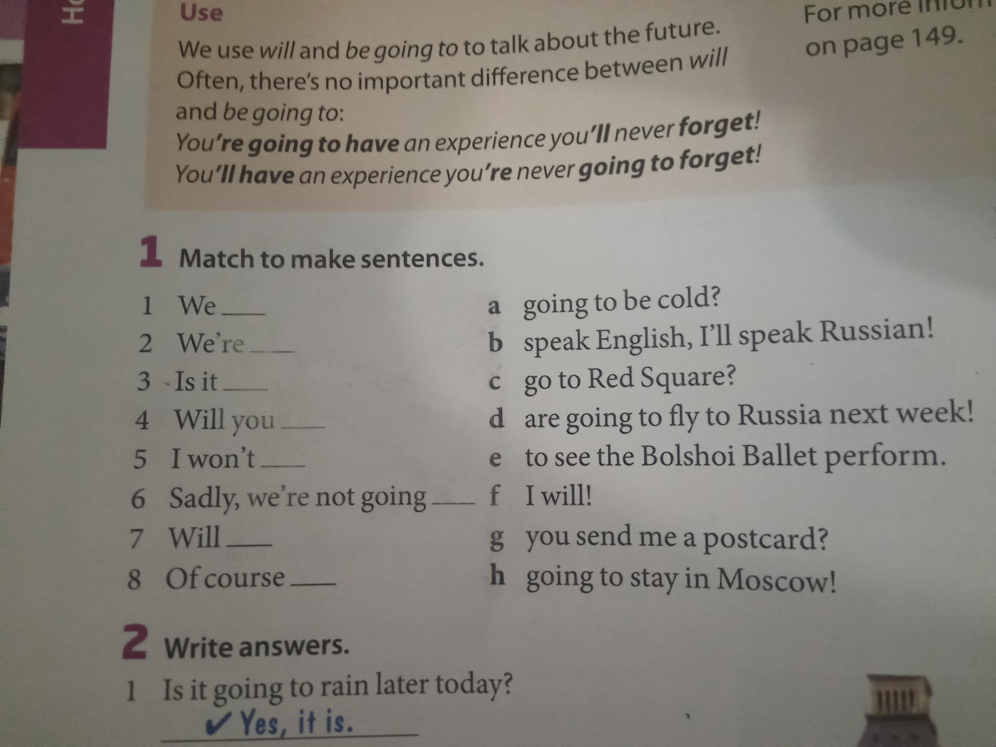 II. Student’s Book, page 44, exercise 1: Соедини части предложений, обращая внимание на правильное употребление Will\ be going to.
