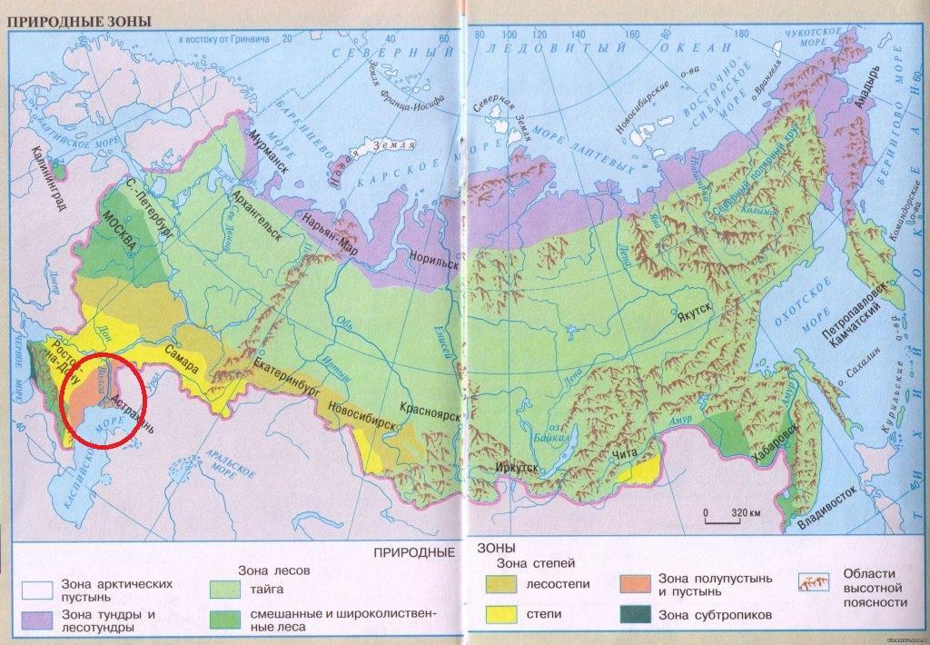 Как видно из карты, которая дана ниже в приложении, зона полупустынь и пустынь занимает в России часть Прикаспийской низменности.