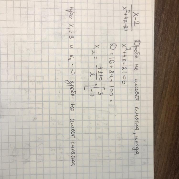 ПОМОГИТЕ, ПОЖАЛУЙСТА, ПО АЛГЕБРЕ! СРОЧНО! При каких значениях переменной "х" дробь х-2/х^2+4х-21 не имеет смысла!?