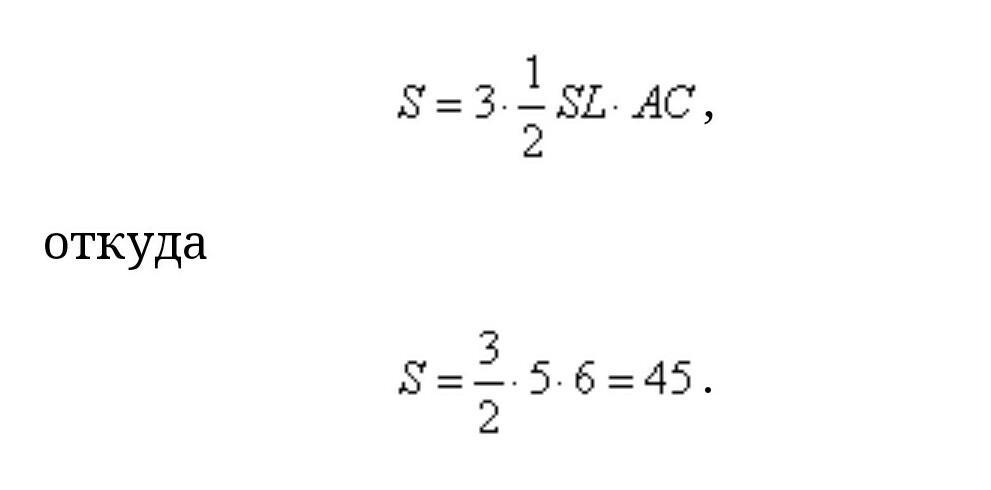 Стороны AB=AC=BC=6, так как треугольник ABC – равносторонний (основание правильной треугольной пирамиды). Гранями правильной треугольной пирамиды являются равнобедренные треугольники со сторонами AS=CS=BS. Тогда отрезок SL – высота треугольника ASC. Площадь боковой поверхности пирамиды равна сумме площадей трех его треугольных граней и равна