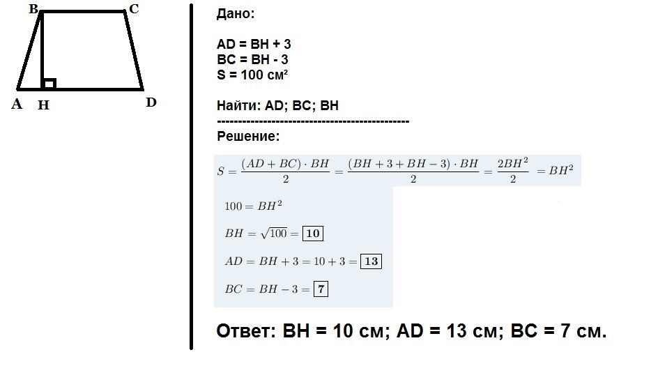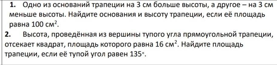 меньше высоты. Найдите основания и высоту трапеции, если её площадь