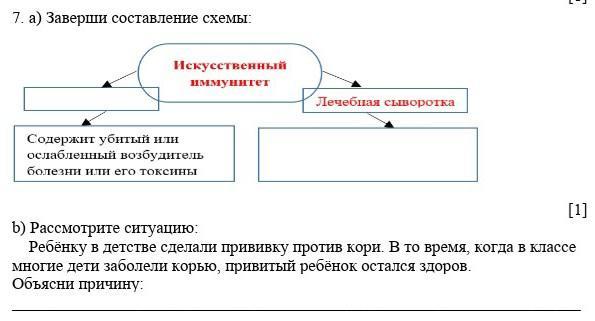 7. а) Заверши составление схемы: b) Рассмотрите ситуацию: Ребёнку в детстве сделали прививку против кори В то время, когда в классе многие дети заболели корью, привитый ребёнок остался здоров. Объясни причину-