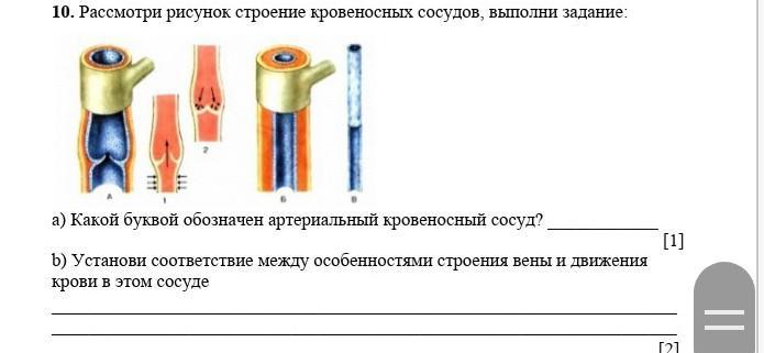 10. Рассмотри рисунок строение кровеносных сосудов, выполни задание: а) Какой буквой обозначен артериальный кровеносный сосуд? b) Установи соответствие между особенностями строения вены и движения крови в этом сосуде