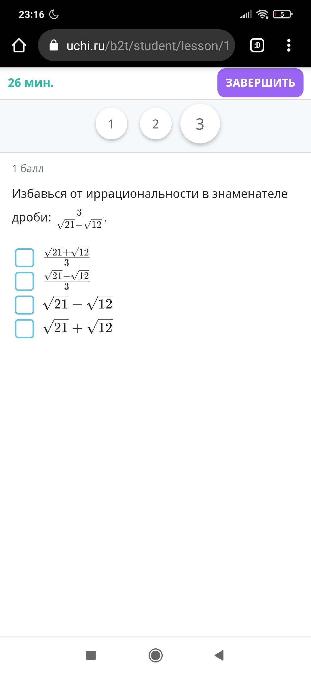 Чтобы избавиться от иррациональности в знаменателе, надо числитель и знаменатель умножить на сопряженное знаменателю выражение.