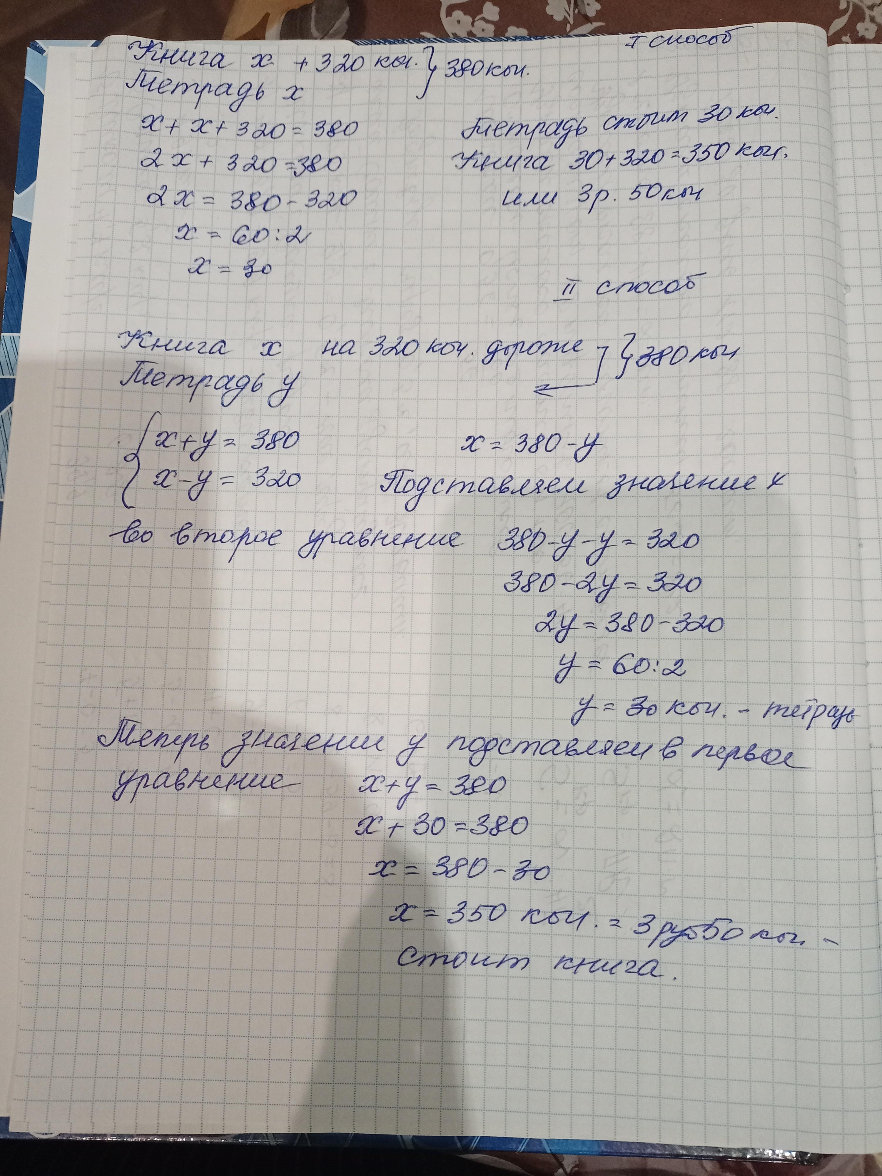 Книга дороже тетради на 3 рубля 20 копеек.книга и тетрадь вместе стоят 3 рубля и 80 копеек. Сколько стоят книга и тетрадь каждая в отдельности?решите задачу двумя способами-с помощью линейного уравнения с одной неизвестным и с помощью системы линейных уравнений с двумя неизвестными