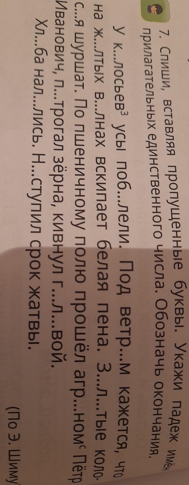 Спиши, вставляя пропущенные буквы. Укажи падеж имён прилагательных единственного числа. Обозначь окончания.