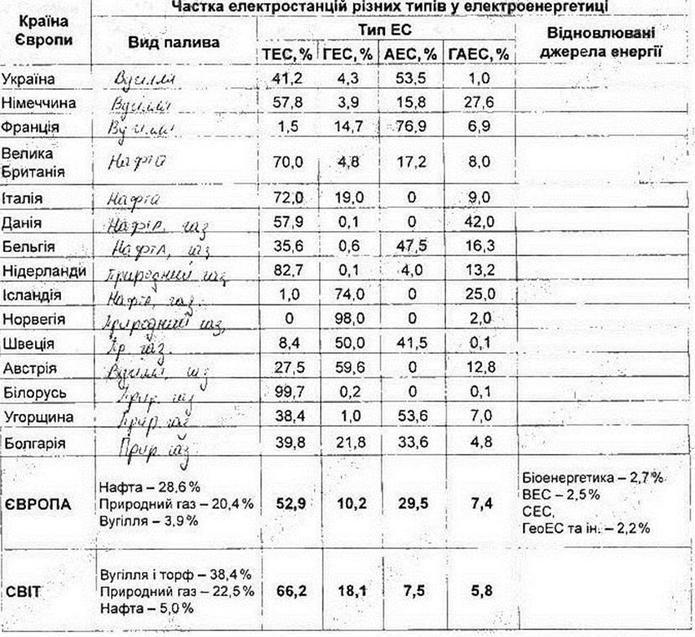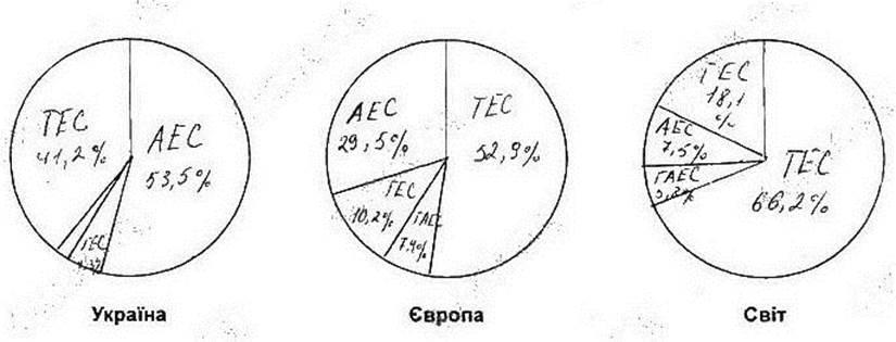 використовуючи різні джерела інформації побудуйте кругові діаграми виробництва електроенергії на електростанціях різних типів у 2-3 країнах Європи (на вибір)
