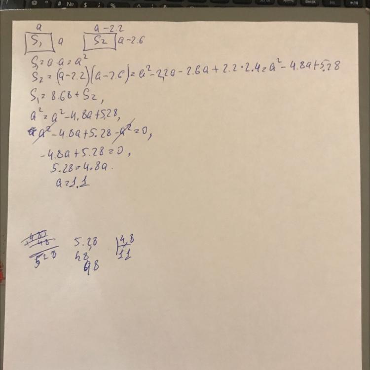 Если одну сторону квадрата уменьшить на 2,6 м, а вторую на 2,2 м, то площадь полученного прямоугольника будет на 8,68 м^2 меньше площади квадрата. Найди сторону квадрата