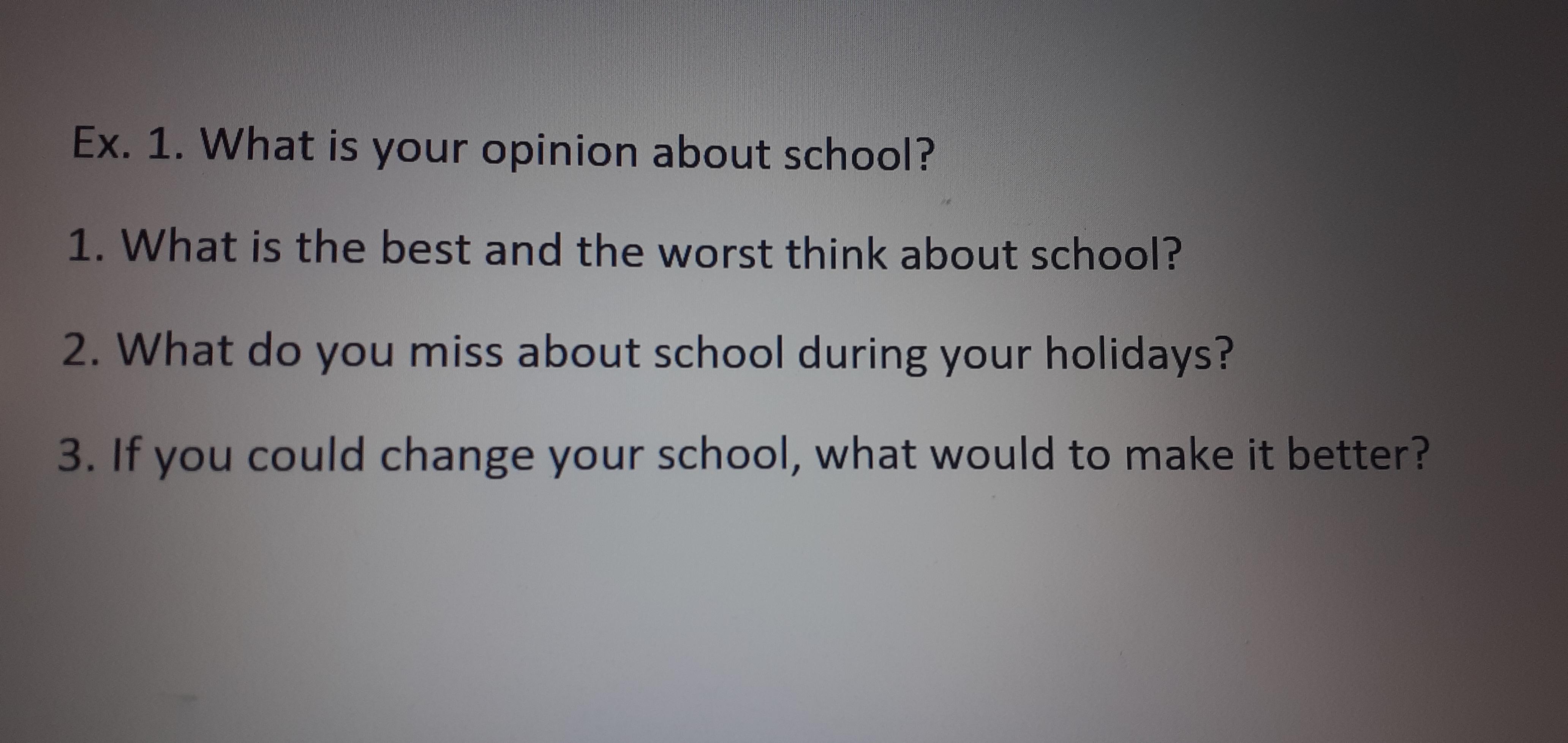 1 The best thing about school is opportunity to communicate with classmates, make friends and get knowledge. The worst thing is wasting my time on learning things that I will forget soon and never ever use in my life.
