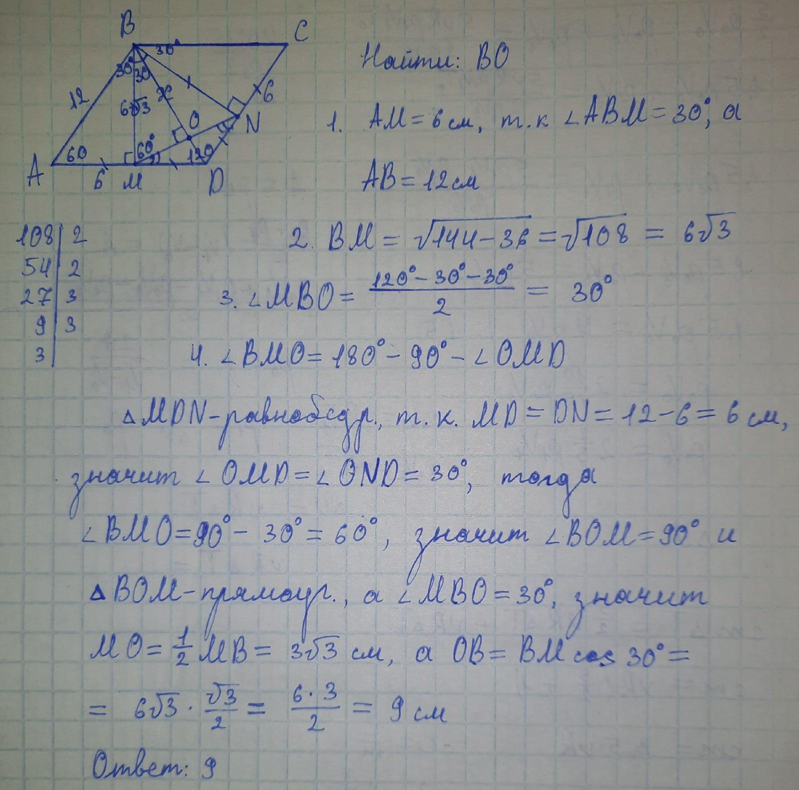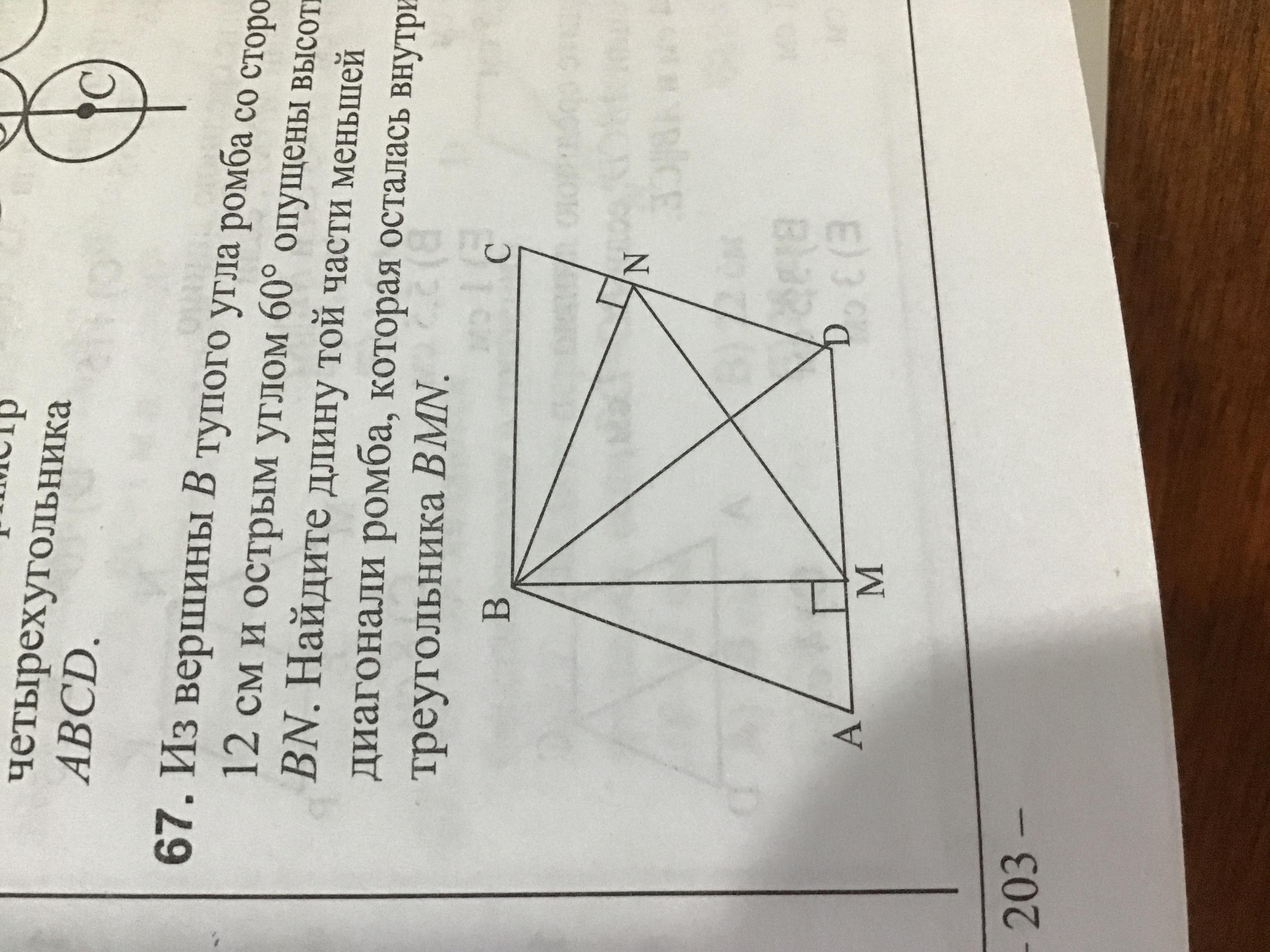 Из вершины B тупого угла ромба со стороной 12 см и острым углом 60° опущены высоты BM и BN. Найдите длины той части меньшей диагонали ромба, которая осталась внутри треугольника BMN. (Изображения прикреплено)