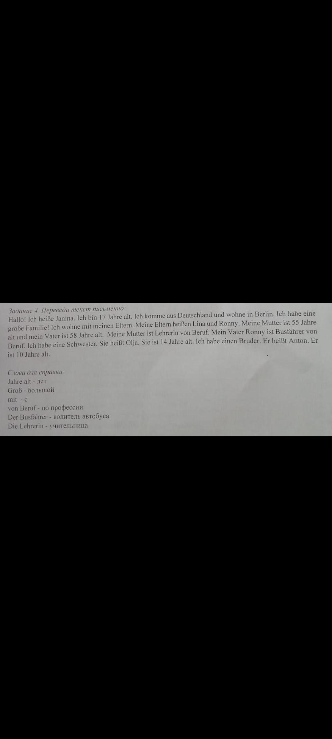 Привет! Меня зовут Янина. Мне 17 лет. Я из Германии, живу в Берлине. У меня большая семья. Я живу с родителями. Моих родителей зовут Лина и Ронни. Моей маме 55 лет, а моему папе - 58. Моя мама - учитель. Мой папа Ронни - водитель автобуса. У меня есть сестра. Ее зовут Оля. Ей 14 лет. У меня есть брат. Его зовут Антон. Ему 10 лет