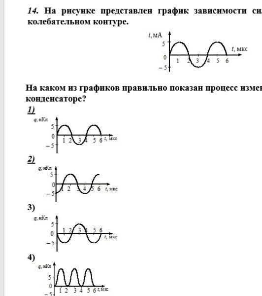 Достаточно увидеть, что график i=i(t) представляет собой sin, значит заряд - q - есть "перевернутая" cos x(то есть найти первообразную). Этой функции соответствует лишь график под номером 2.