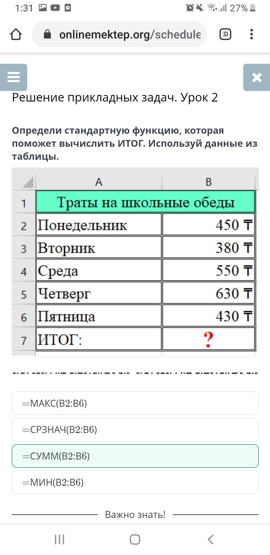 Определи стандартную функцию которая поможет вычислить итог используя данные из таблицы решения прикладных задач