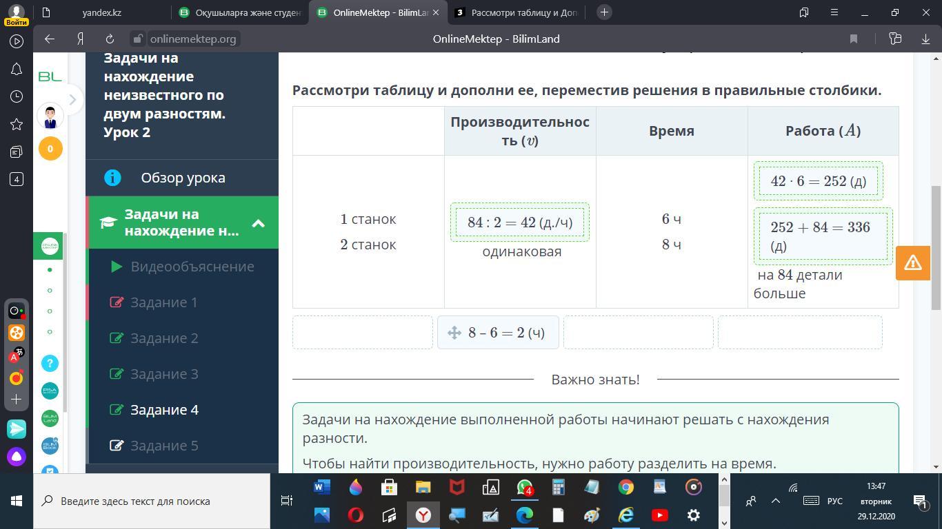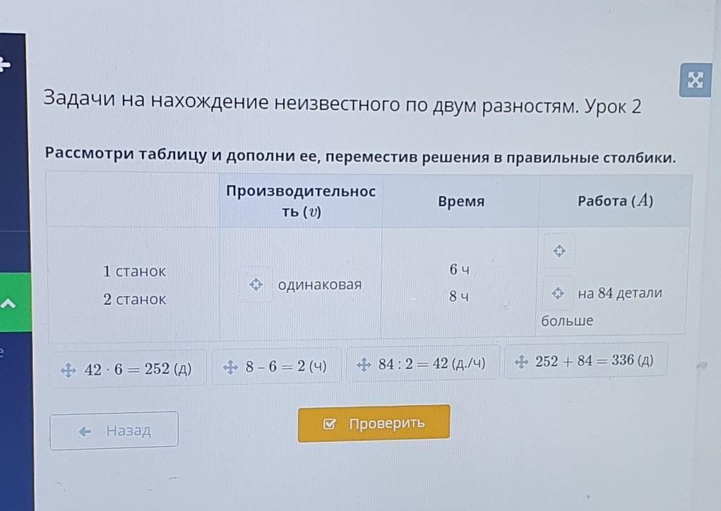 Рассмотри таблицу и Дополните её переместив решения в правом столбике первый станок второй станок производительность одинаковое время 6:00 в 8:00 работа на 84 детали больше