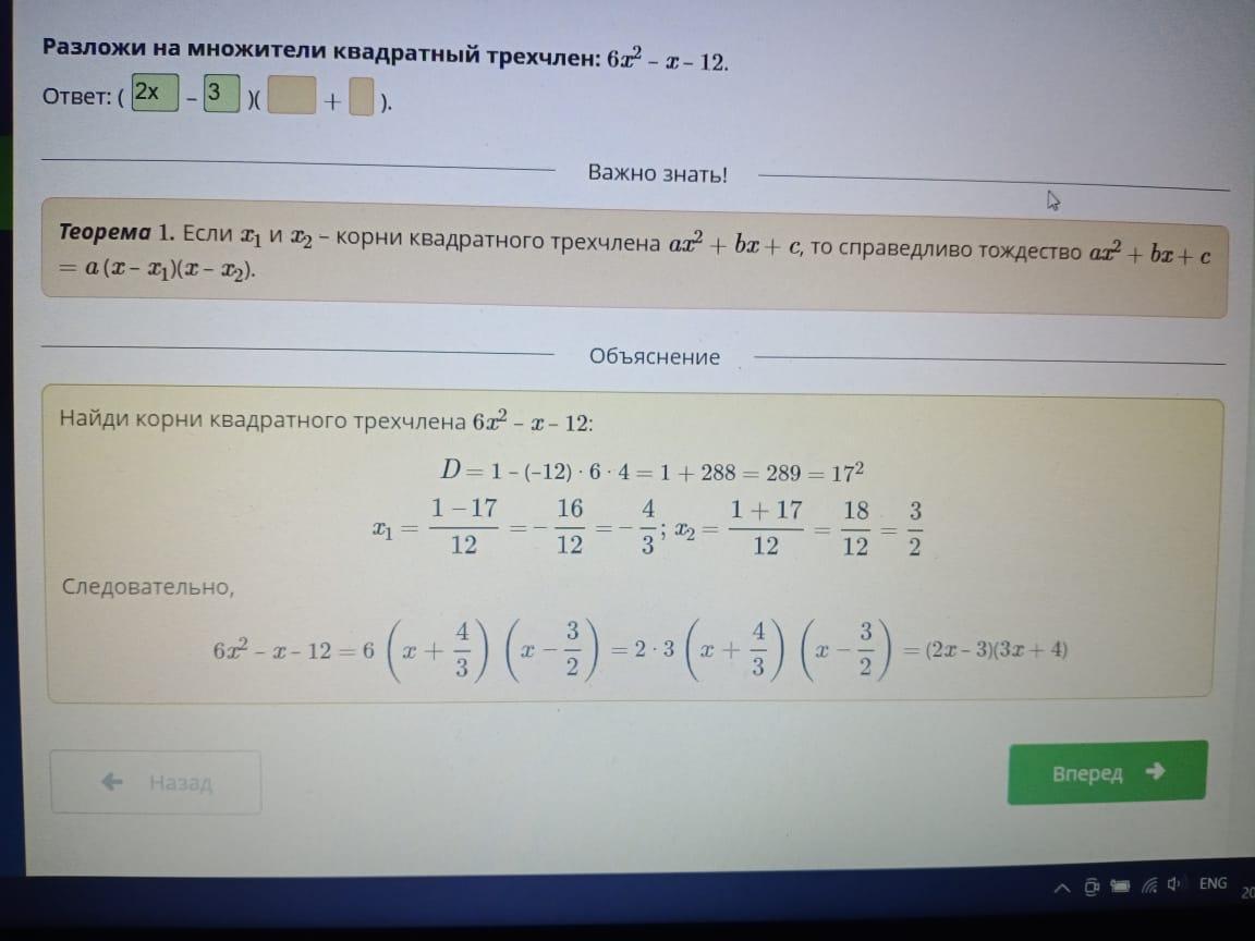 Разложи на множители квадратный трехчлен: 6x2 – x – 12.