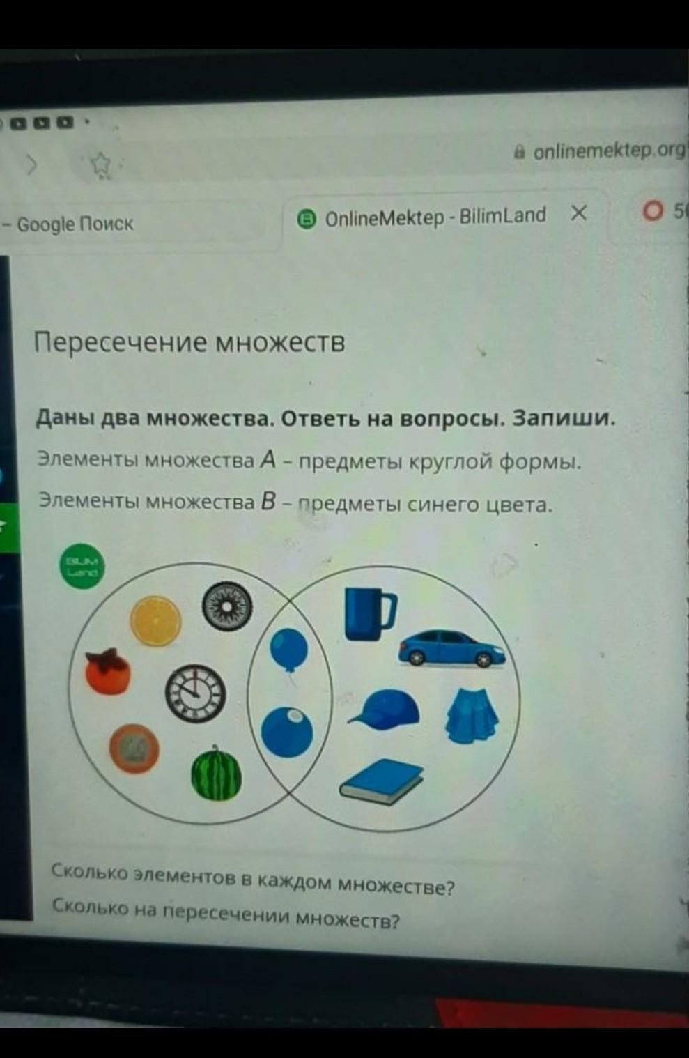 В левой части арбуз,часы,зеркало,колесо,яблоко потому что они круглые соответственно они с множеством круглых,с права синии книги,машина,кепка соответственно они в разделе синии.