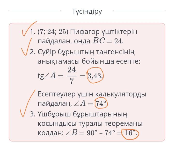 2) Вычислить определение тангенса острого угла tg угол А знак равно 24/7= 3,43.