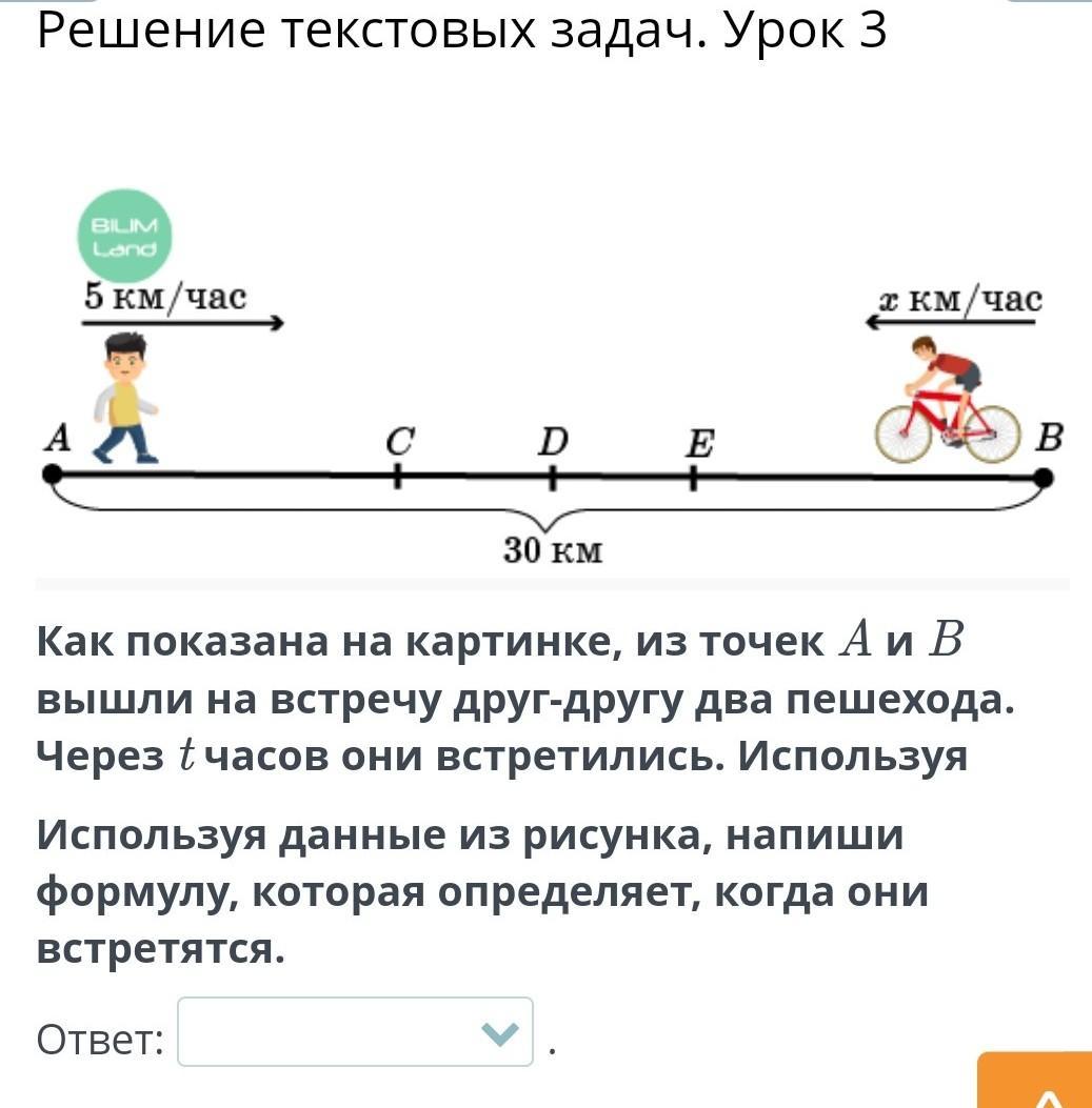 Как показана на картинке, из точек A и B вышли на встречу друг-другу два пешехода. Через t часов они встретились. Используя