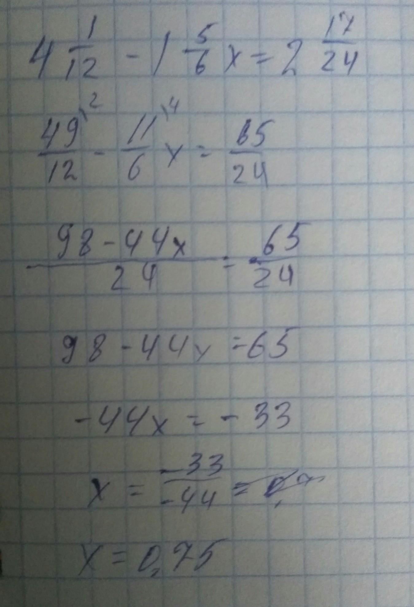 4 1/12 - 1 5/6 x = 2 17/24 (четыре челых одна двеннадцатая минус одна целая пять шестых икс равно = две целых семнадцать двадцать четвертых)