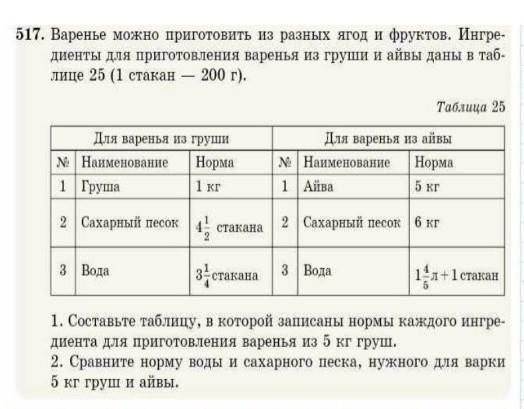 Вода: считаю что 1л воды это 1 кг, Для 5 кг груш надо 3,25 л воды, а для 5 кг айвы 1(4/5) + 1 стакан, надо это перевести в чисто литры это будет 1,8л + 0,2л= = 2л (т.к. 1(4/5) это 1,8, а 1 стакан = 200г = 200мл = 0,2л). Видим что для варки 5 кг груш надо на 1,25 л больше воды чем для варки айвы.