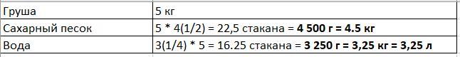 Таблицу я составил. Теперь надо сравнить норму воды и сахара для варки 5 кг груш и айвы. Сахар: для 5 кг груш: 4,5 кг, для 5 кг айвы: 6 кг, мы видим что сахара для 5 кг груш надо на 25% меньше чем для кг айвы.