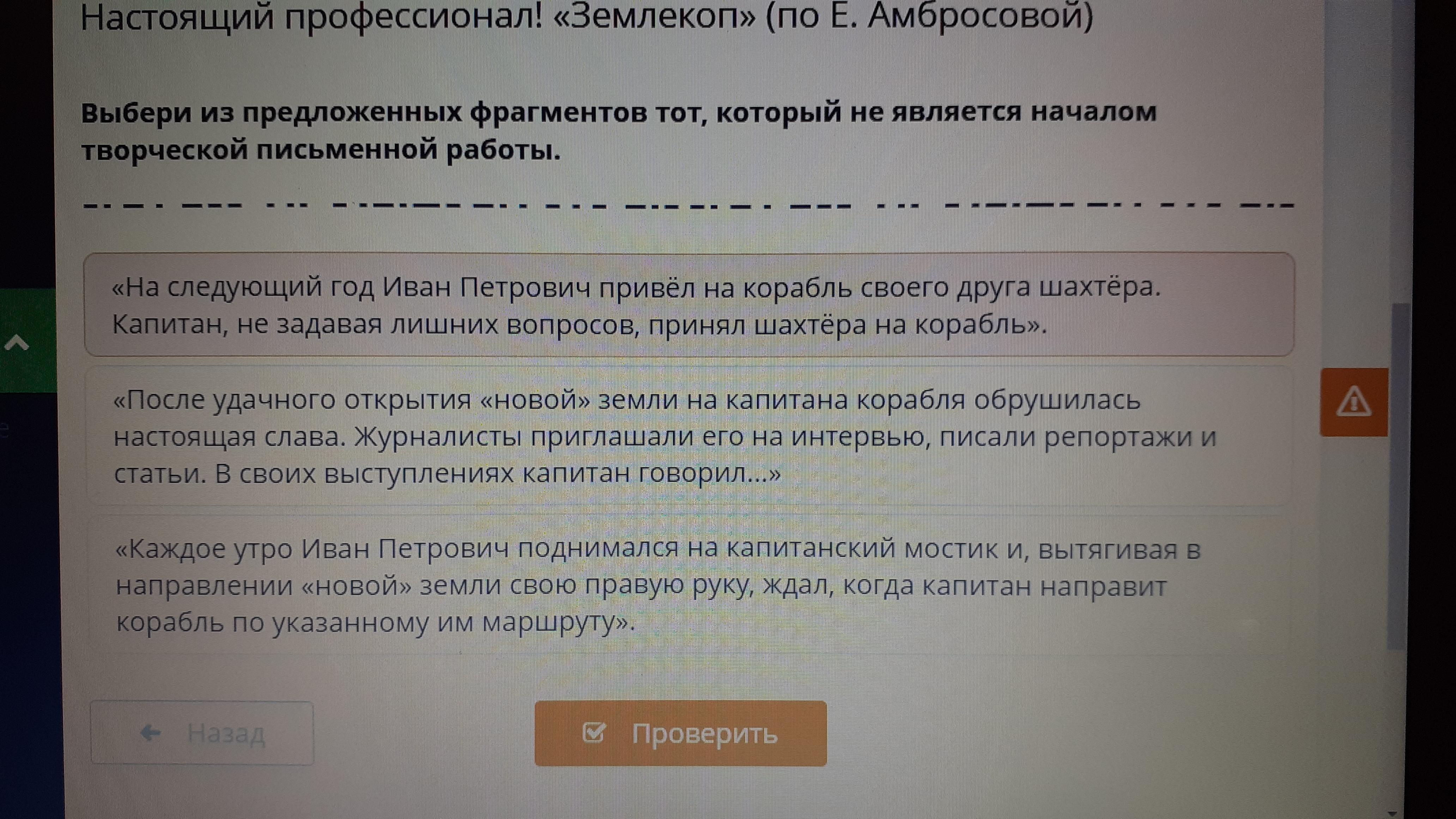 Выбери из предложенных фрагментов тот который не является началом творческой письменной работы.прмогите ПОЖАЛУЙСТА СРОЧНО!ДАМ 15 БАЛЛОВ