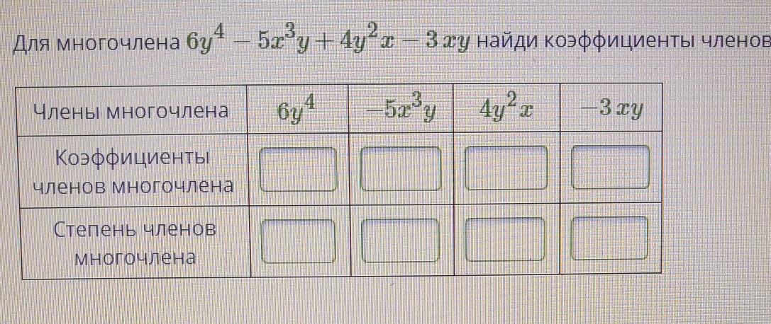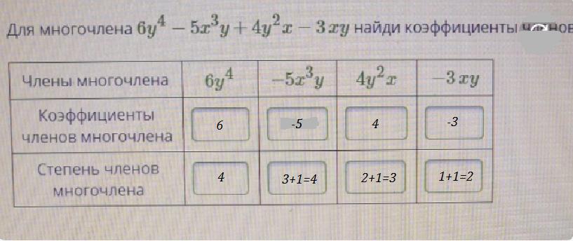 Для многочлена 6y^4-5x^3y+4y^2x-3xy найди коэффициент членов и степень каждого члена