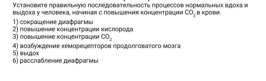 установите правильную последовательность процессов нормальных вдоха и выдоха у человека, начиная с повышения концентрации со2 в крови. 1) сокращение диафрагмы 2) повышение концентрации кислорода 3) повышение концентрации со2 4) возбуждение хеморецепторов продолговатого мозга 5) выдох 6) расслабление диафрагмы