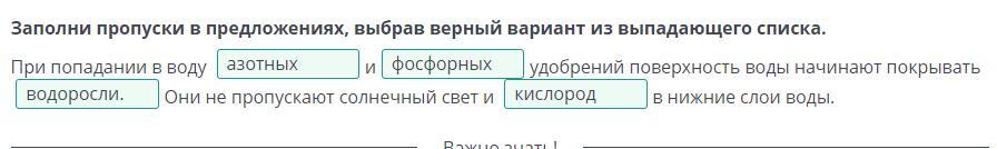 Заполни пропуски в предложениях, выбрав верный вариант из выпадающего списка. При попадании в воду и удобрений поверхность воды начинают покрывать Они не пропускают солнечный свет и в нижние слои воды.