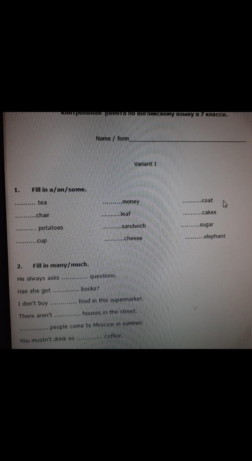 1.A tea, a chair, some potatoes, a cup, some money, a leaf, a sandwich, some cheese, a coat, some cakes, some sugar, an elephant