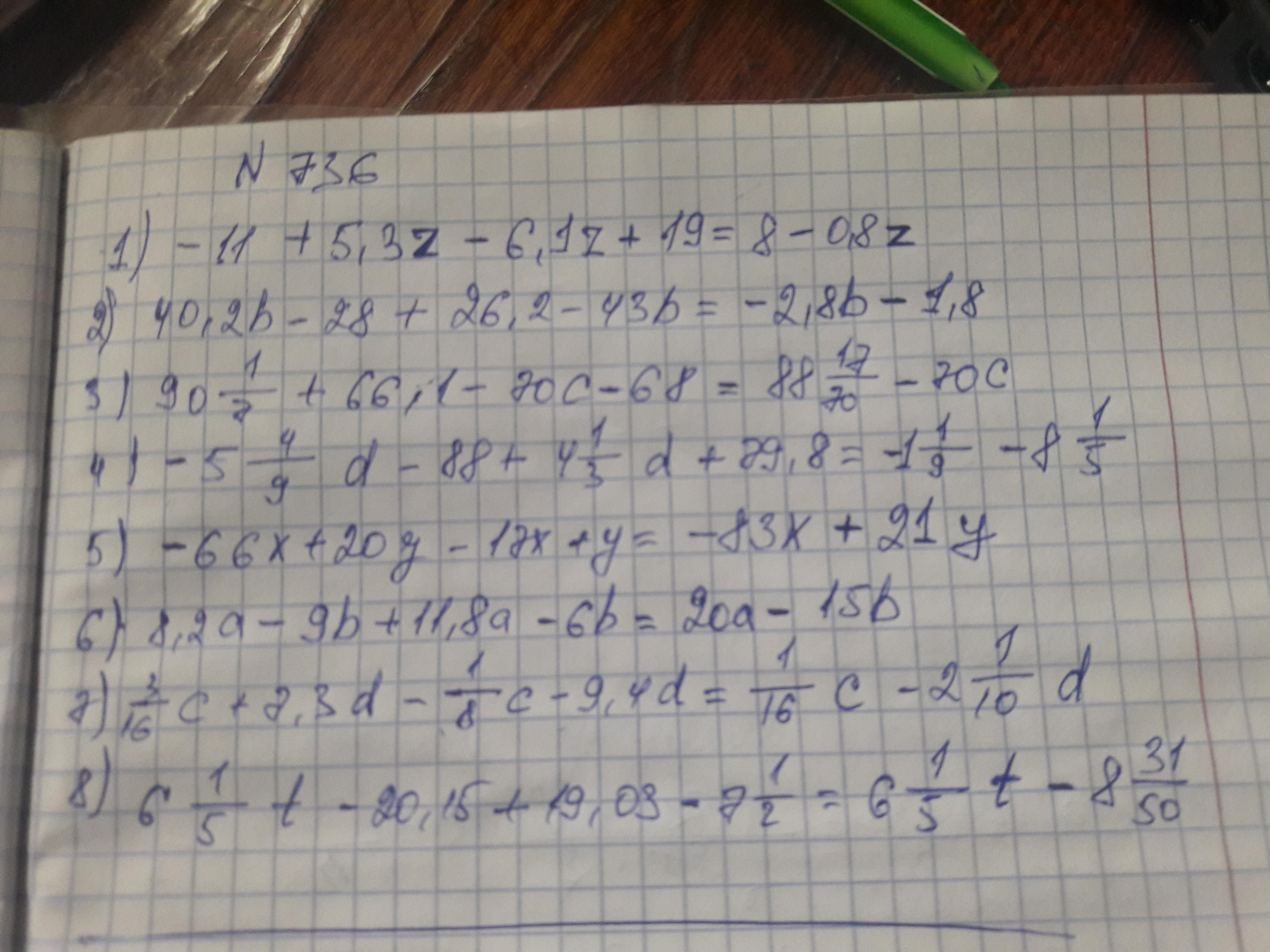 736. 1) -11 + 5,32 – 6,12 + 19; 2) 40,26 – 28 + 26,2 - 436;