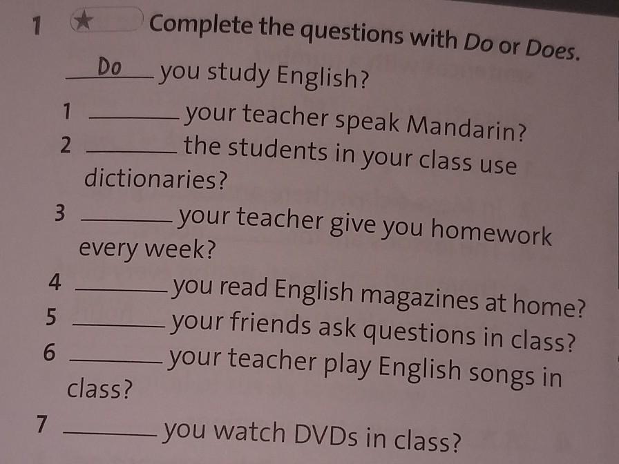 Complete the questions with Do or Does. you study English? your teacher speak Mandarin? the students in your class use Do dictionaries? your teacher give you homework every week? you read English magazines at home? your friends ask questions in class? your teacher play English songs in class? you watch DVDS in class? ** Answer the questions in exercise 1. Дам 37 балов помогите пж