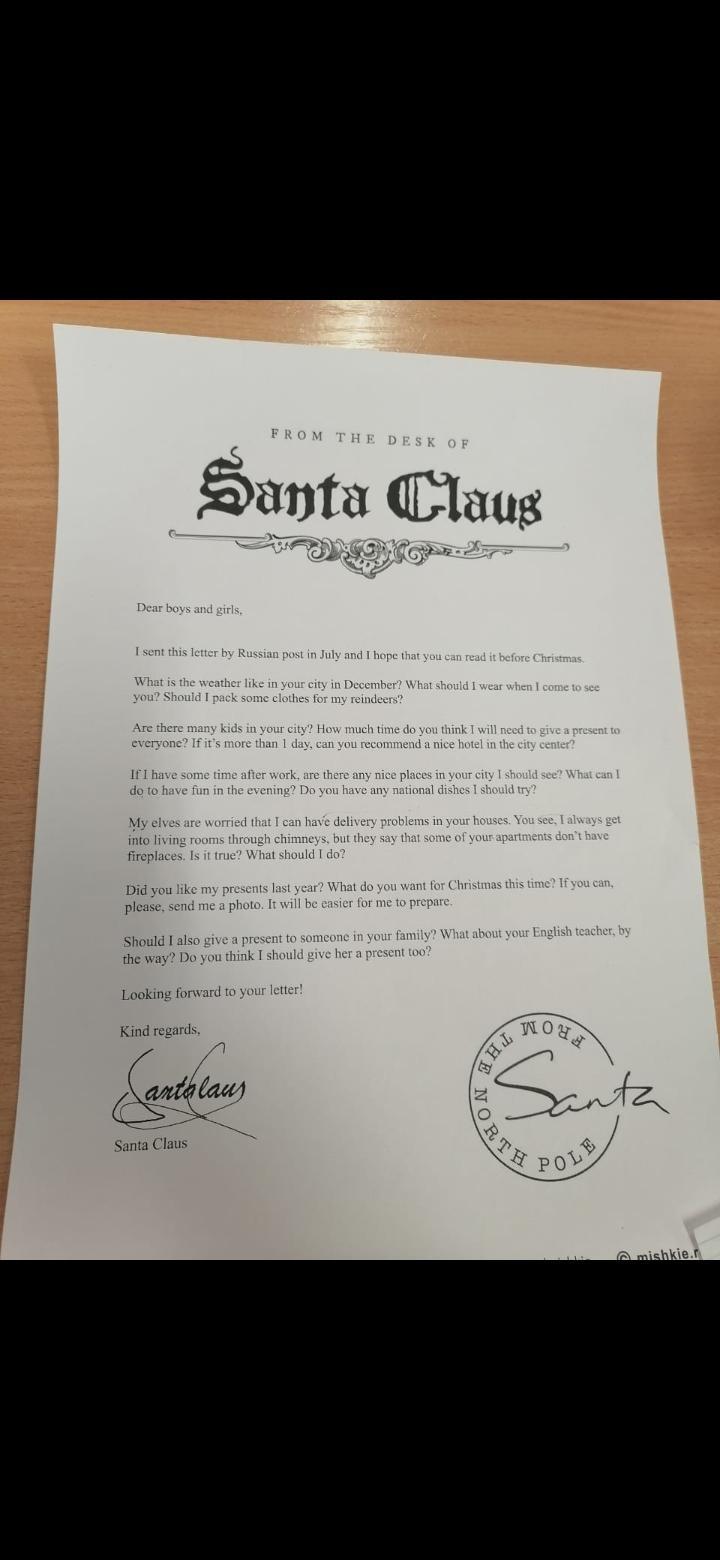 Я отправил это письмо почтой России в июле и надеюсь, что вы сможете его прочесть перед Рождеством. Какая погода в вашем городе в декабре? Что мне надеть, когда я приду к вам? Собрать одежду для своих оленей. Много ли в вашем городе детей? Как вы думаете, сколько времени мне понадобится, чтобы всем подарить подарок? Если это больше, чем один день, порекомендуете ли вы хороший отель в центре города? Если у меня будет немного времени после работы, есть ли в вашем городе какие-нибудь интересные места, которые мне стоит посетить? Чем я могу развлечься вечером? Есть ли у вас какие-нибудь национальные блюда, которые стоит попробовать? Мои эльфы обеспокоены тем, что у меня могут возникнуть проблемы с доставкой в ваши дома. Понимаете, я всегда попадаю в жилые комнаты через дымоходы, но они говорят, что в некоторых ваших квартирах нет каминов. Это правда? Что я должен делать? Вам понравились мои подарки в прошлом году? Что ты хочешь на этот раз на Рождество? Если можете, пришлите мне фото. Мне будет легче подготовиться. Стоит ли сделать подарок кому-нибудь из вашей семьи? А как насчет твоего учителя английского, кстати? Как думаешь, мне тоже стоит сделать ей подарок? С нетерпением жду вашего письма!