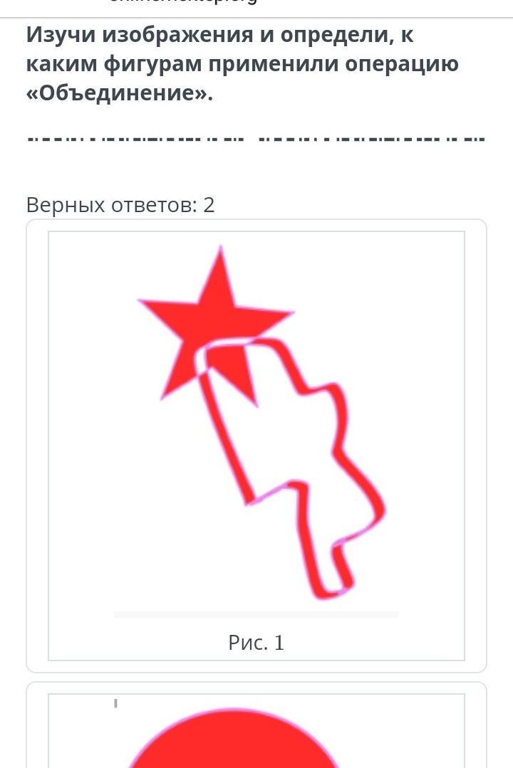 Изучи изображения и определи, к каким фигурам применили операцию «Объединение». верных ответов 2