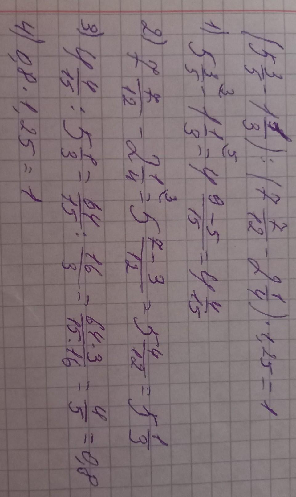7/12 - 2 3/12)*5/4 = 64/15 : 16/3 * 5/4 = 64/15*3/16*5/4=4/5*1/1*5/4=1