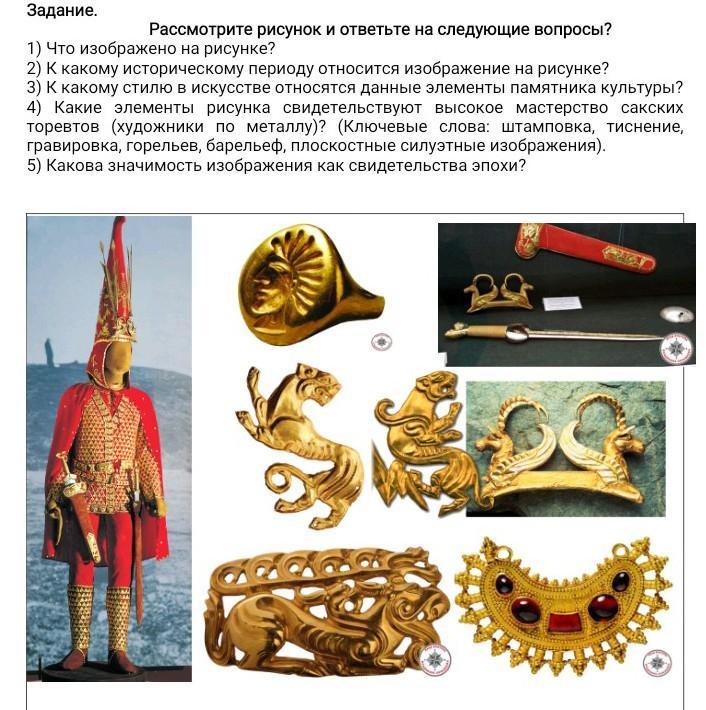 4) Какие элементы рисунка свидетельствуют высокое мастерство сакских торевтов (художники по металлу)? (Ключевые слова: штамповка, тиснение, гравировка, горельев, барельеф, плоскостные силуэтные изображения).