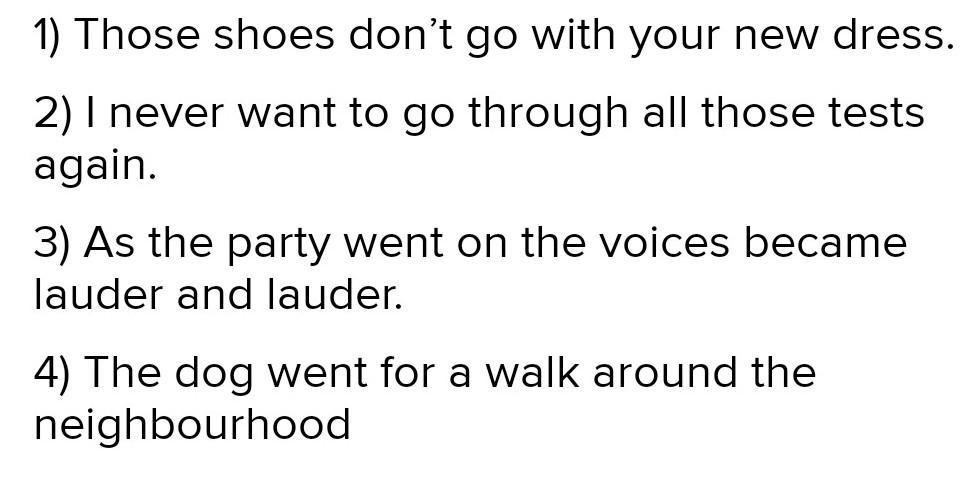 Read the beginnings of the sentences very attentively. Make sure that you know all the meanings of the phrasal verb “go”. Прочитайте первую часть предложений и убедитесь, что вам знакомы все значения фразового глагола “go”.