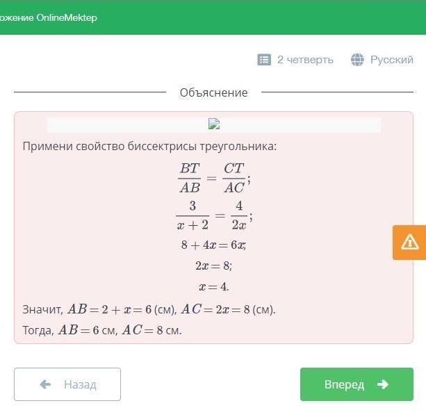 Биссектриса AT делит сторону BC треугольника ABC на отрезки равные BT = 3 см и TC = 4 см . Если AB = (2 + x) см, AC = 2x см, то найди длины сторон AB и AC.