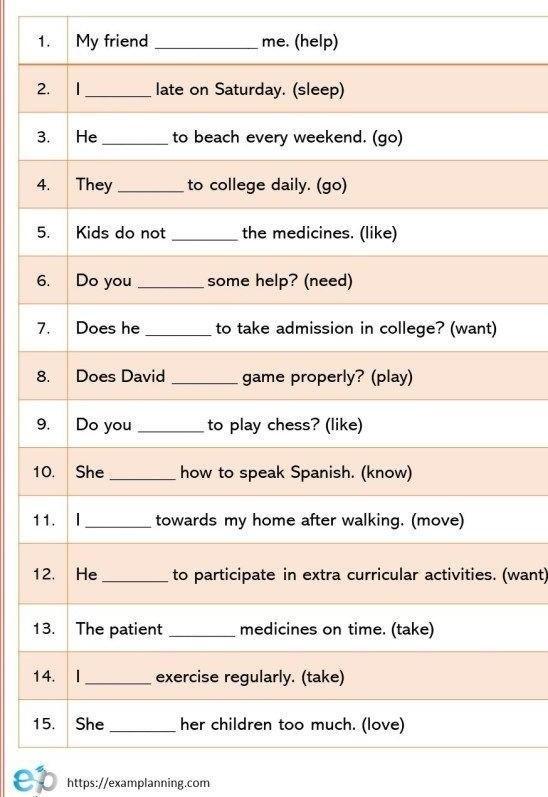 Ответ:1) Helps 2) slept 3) goes 4) go 5) like 6) need 7) want 8) play 9) like 10) know 11) move 12)want 13) takes 14) take 15) loves