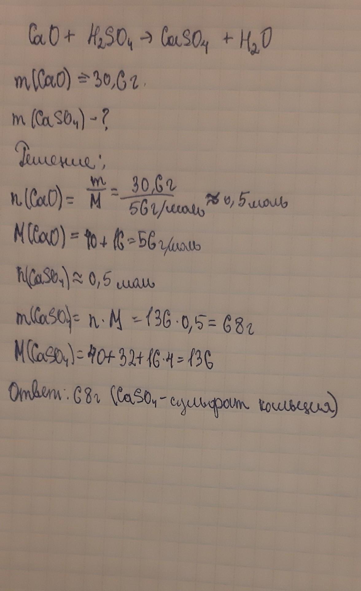 Решите задачу. Оксид кальция массой 30,6 г прореагировал с избытком серной кислоты. Определите массу образовавшейся соли. Дайте ей название.
