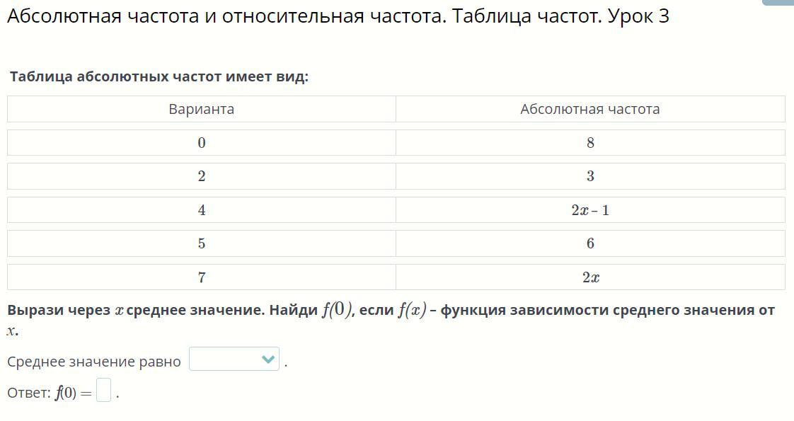 Абсолютная частота и относительная частота. Таблица частот. Урок 3 Таблица абсолютных частот имеет вид: Варианта Абсолютная частота 0 8 2 3 4 2x – 1 5 6 7 2x Вырази через x среднее значение. Найди f(0), если f(x) – функция зависимости среднего значения от х. Среднее значение равно . Ответ: f(0) = .